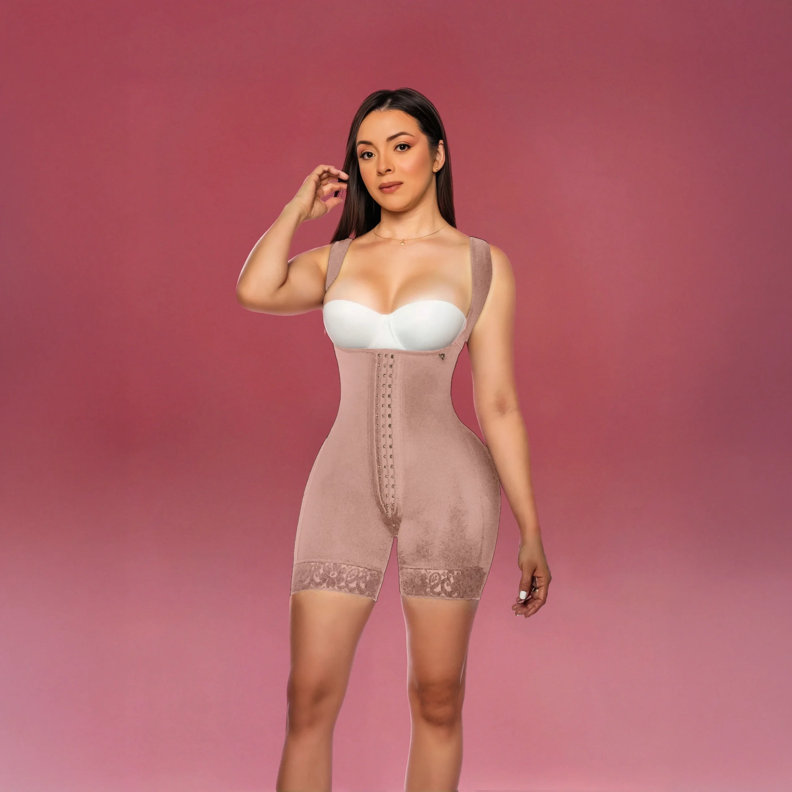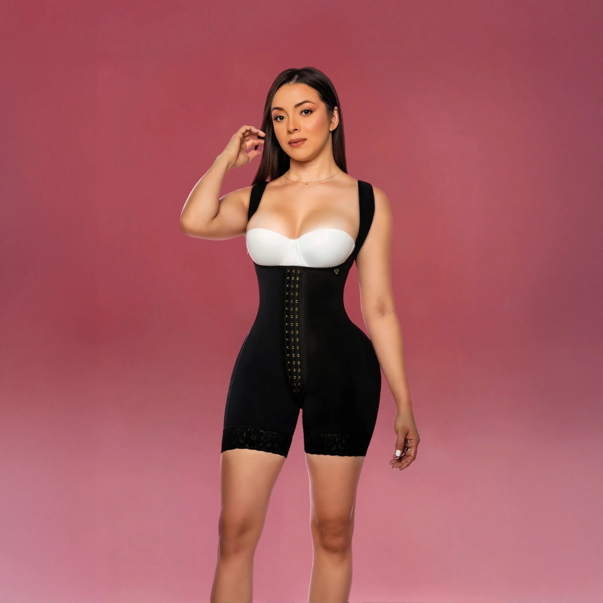 Esta faja de pierna corta cuenta con un doble refuerzo en el abdomen que moldea y afina tu cintura con una compresión gentil, creando una transición fluida hacia un máximo realce de glúteos (Cola Real Máx). Tus curvas se verán elevadas y con un volumen armonioso, proyectando una imagen de confianza y atractivo.